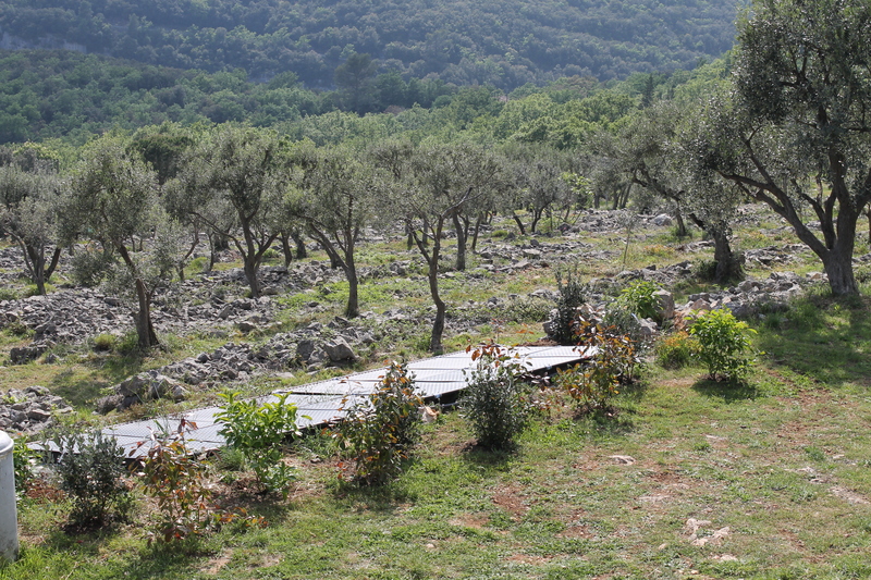 Solar panels to heat the pool against the backdrop of our olive terraces